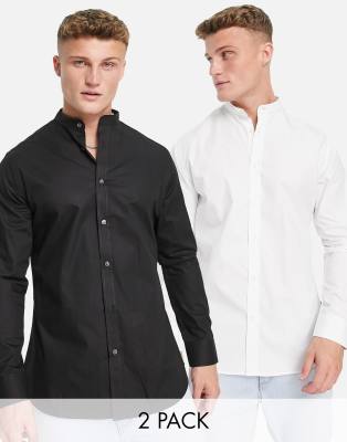 French Connection – 2er-Pack Hemden in Weiß und Schwarz mit Granddad-Kragen