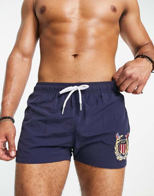 GANT – Badeshorts in Marineblau mit Wappenstickerei