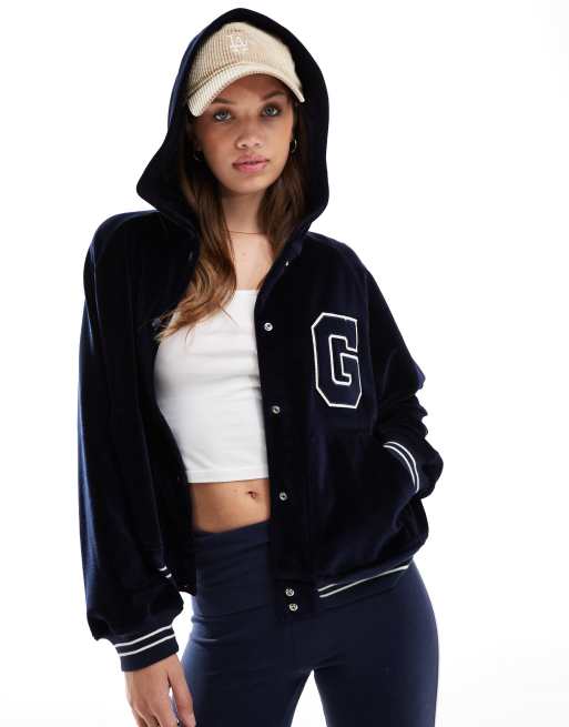 GANT – Velours-Bomberjacke in Marineblau mit Kapuze und College-Logo