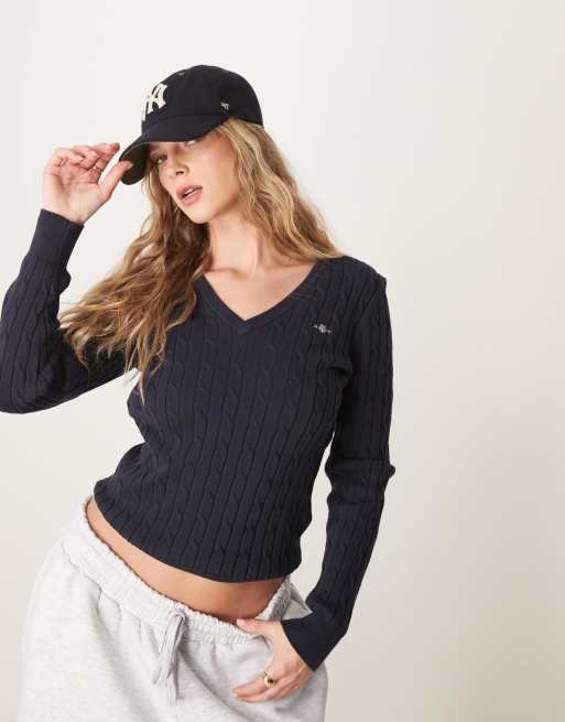 GANT – Zopfstrick-Pullover aus Baumwolle in Marineblau mit V-Ausschnitt und Logo