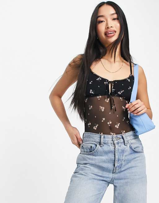 Gilly Hicks – Body aus Netzstoff in Schwarz mit Blumenmuster
