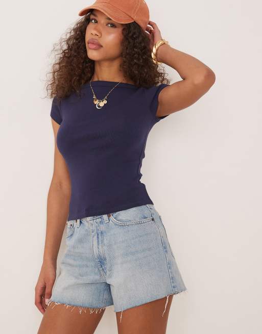 Gina Tricot – Kurzärmliges Slim Fit Oberteil in geripptem dunklem Marineblau mit U-Boot-Ausschnitt