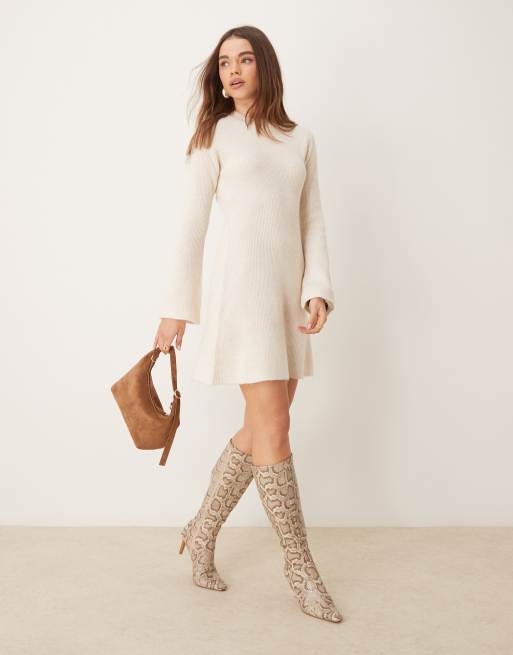 Gina Tricot – Mini-Skater-Kleid aus Rippstrick in Wollweiß mit Rundhalsausschnitt