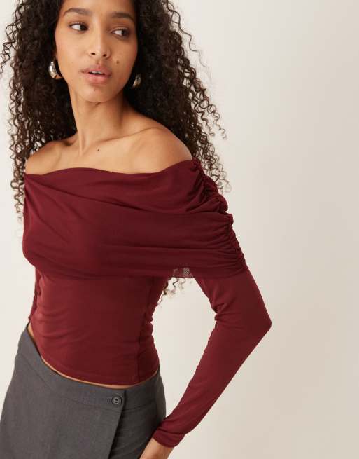 Gina Tricot – Schulterfreies Netzstoff-Oberteil in Burgunderrot
