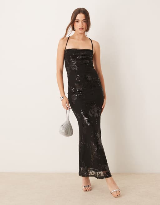 Gina Tricot – Stretch-Maxikleid in Metallic-Schwarz mit Jacquard-Blumenmuster und Rückenausschnitt