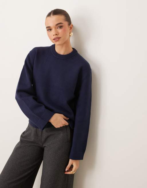 Gina Tricot – Strickpullover in Blau mit Rundhalsausschnitt und weiten Ärmeln