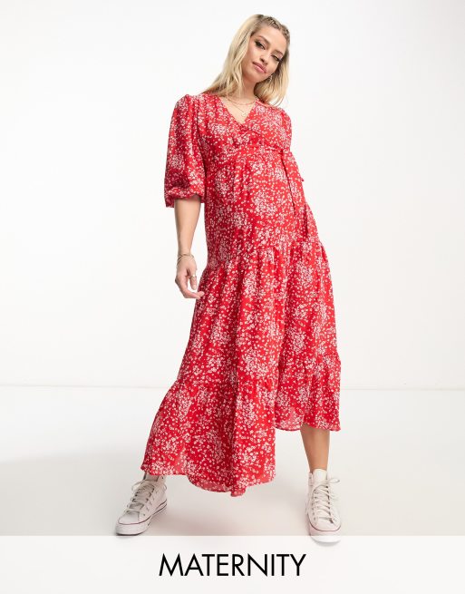 Glamorous Maternity – Gestuftes Maxi-Wickelkleid in Rot mit Blümchenmuster, Umstandsmode