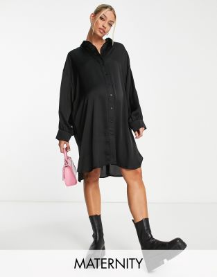 Glamourous Bloom – Durchgeknöpftes Satin-Hemdkleid in Schwarz