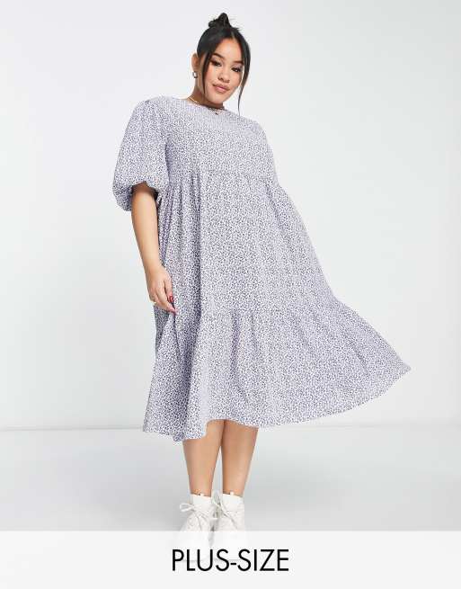 Glamorous Curve – Hinten gebundenes, gestuftes Midi-Hängerkleid in Blau mit Blümchenmuster