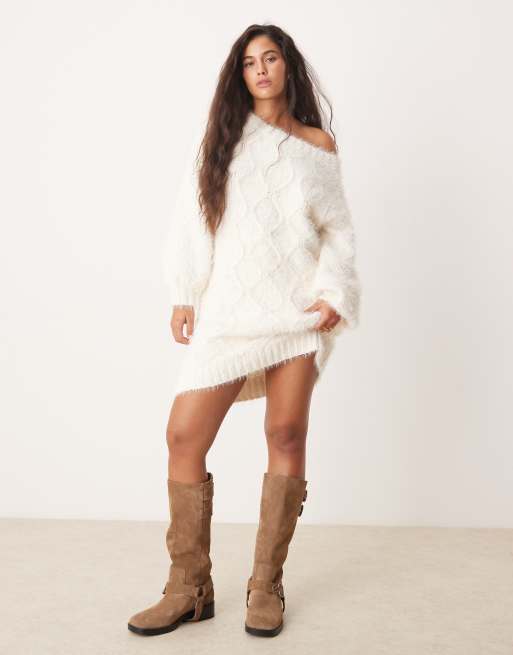 Glamorous – Flauschiges, gestricktes Mini-Pulloverkleid in Cremeweiß mit Rautenmuster