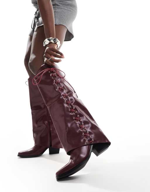 Glamorous – Kniehohe Westernstiefel in Burgunderrot mit Absatz, Umschlag und Schnürung mit Schleife