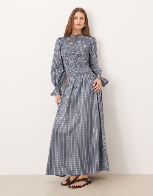 Glamorous – Langärmliges Maxikleid mit Karomuster in Blau und Grün und tiefer Taille