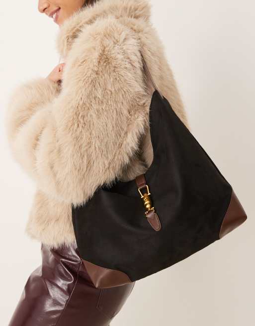Glamorous – Schulter-Tragetasche in Schwarz und Hellbraun mit Wildlederimitat-Einsätzen
