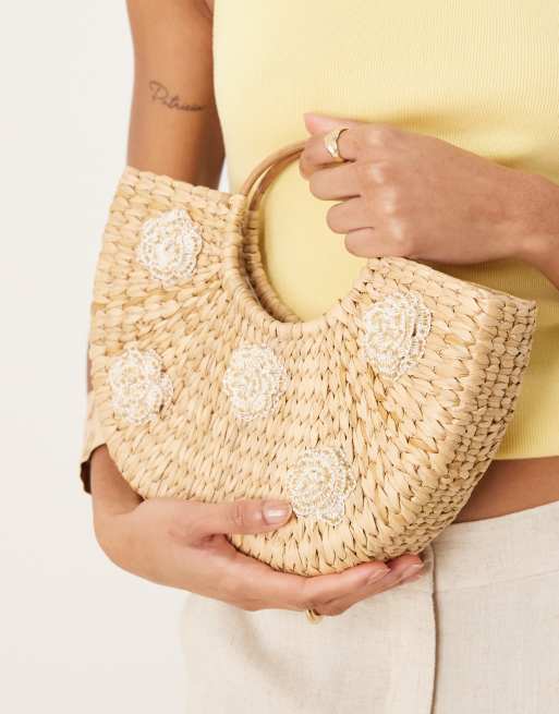 Glamorous – Tragetasche aus Stroh in natürlichem Farbton mit Blumenverzierung