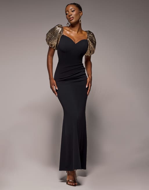 Goddiva – Maxikleid aus Jacquard in Schwarz mit Puffärmeln und Herzausschnitt