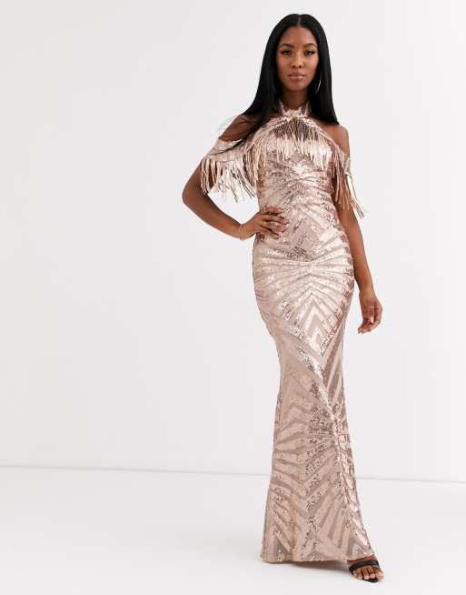 Goddiva – Schulterfreies Maxikleid mit Quasten und goldenen Pailletten