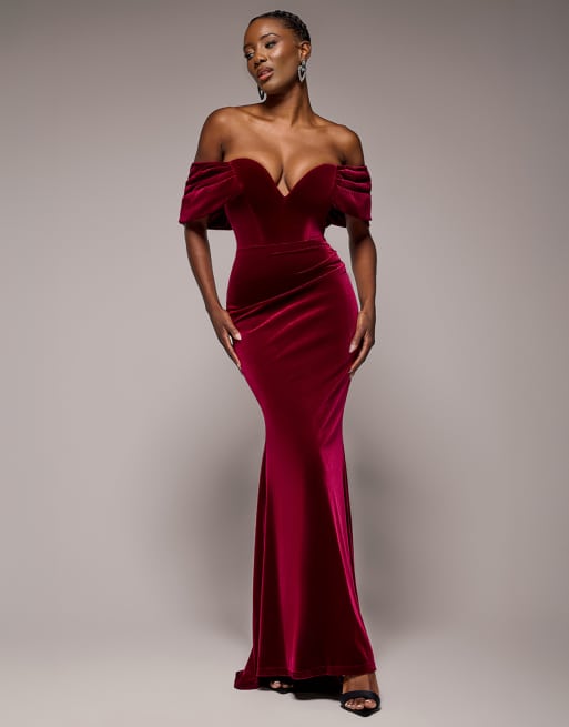 Goddiva – Schulterfreies, tief ausgeschnittenes Maxikleid aus Samt in Burgunderrot