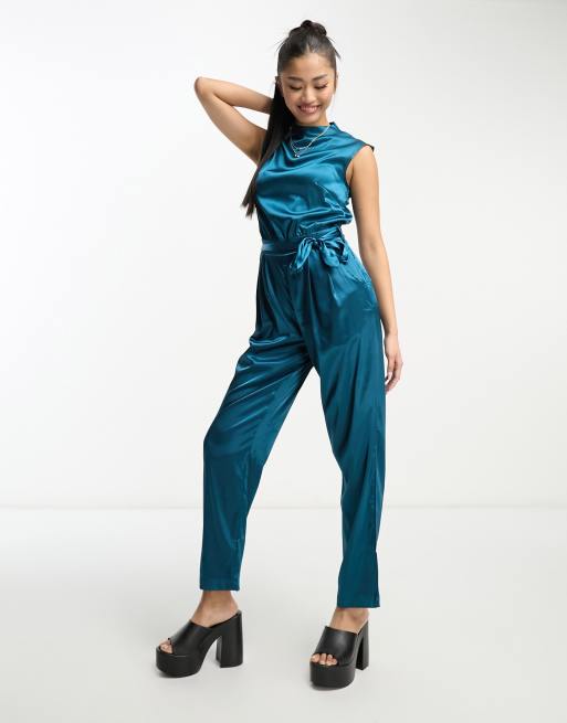 Heartbreak – Hochgeschlossener, geraffter Satin-Jumpsuit in Blaugrün