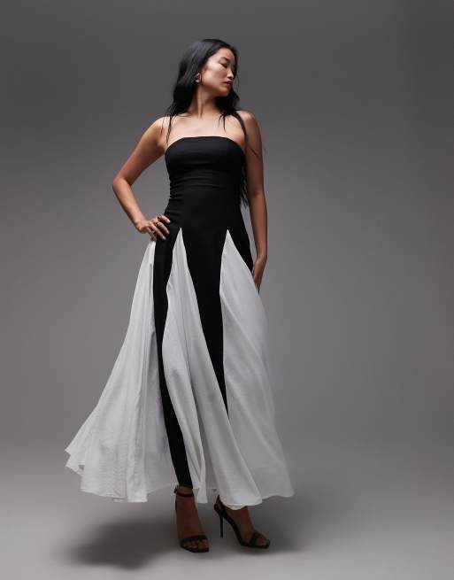 Heiress Beverly Hills – Strukturiertes, trägerloses Maxikleid in Blau und Weiß mit farblich abgesetzten Godet-Falten