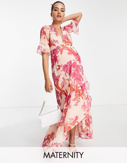 Hope & Ivy – Umstandsmode – Geblümtes Maxi-Wickelkleid in Fuchsia mit Flatterärmeln