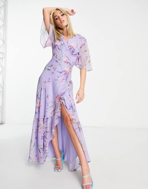 Hope & Ivy – Geblümtes Maxi-Wickelkleid in Lila mit Flügelärmeln