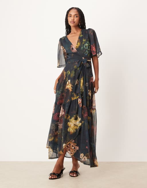 Hope & Ivy – Maxikleid mit dunkelgrünem Blumenmuster und Wickeldesign vorne
