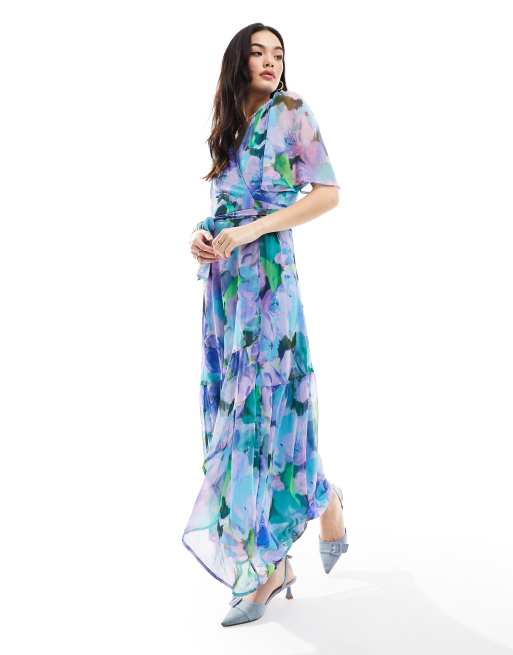 Hope & Ivy – Wickel-Maxikleid in Blau mit Blumenmuster und Rüschen