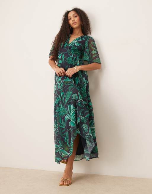 Hope & Ivy – Wickel-Maxikleid in Türkis mit Palmenprint und Flatterärmeln