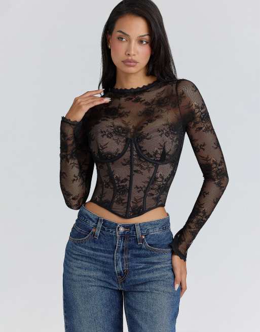 House of CB – Zoe – Langärmliges Korsett-Oberteil aus schwarzer Spitze