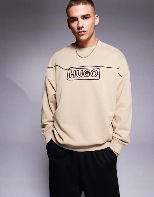 HUGO BLUE – Noideryos – Locker geschnittenes Sweatshirt in Beige mit linearem Logo