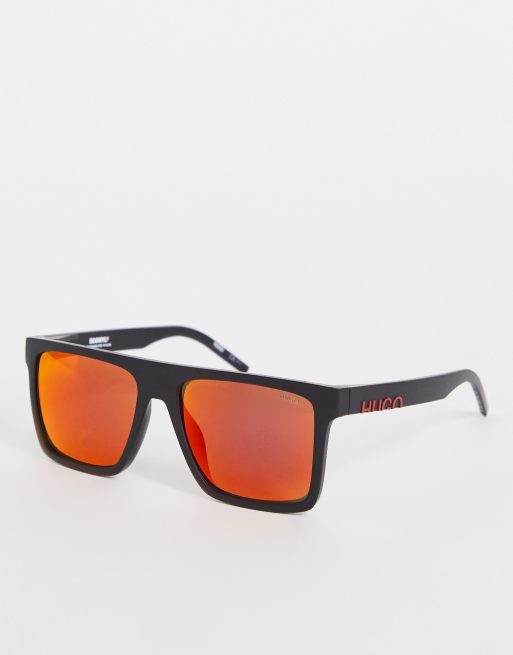 HUGO – Eckige Sonnenbrille in Mattschwarz mit orangen Gläsern