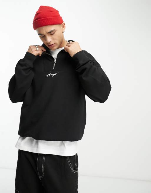 HUGO – Dogota – Lässig geschnittenes Sweatshirt in Schwarz mit Logoschriftzug und kurzem 1/4-Reißverschluss