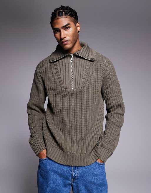 HUGO Red – Srigg – Gerippter Strickpullover in Grau mit kurzem Reißverschluss