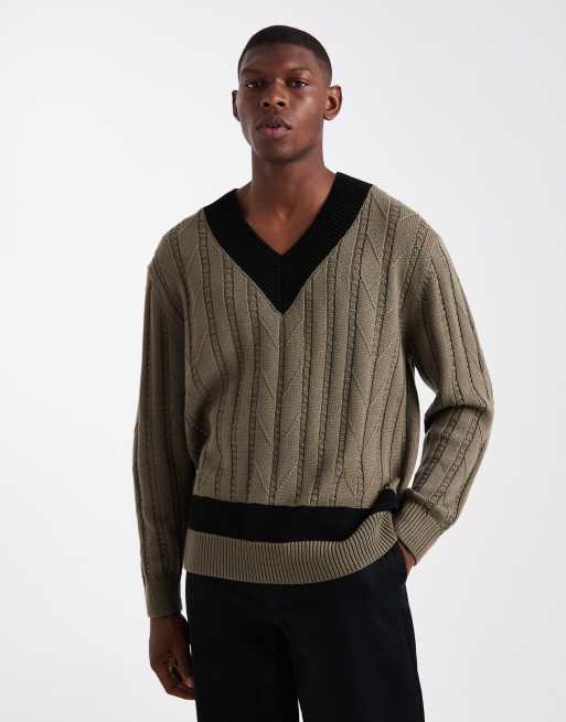 HUGO Red – Stiggid – Oversize-Strickpullover in Mittelgrau mit Zopfmuster und V-Ausschnitt