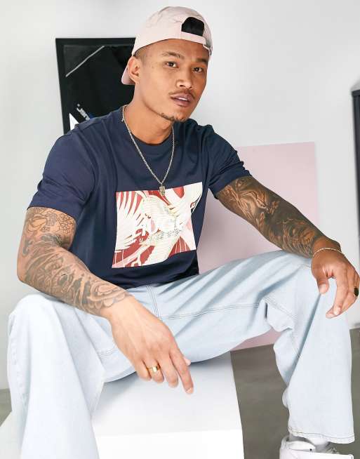 HUGO – T-Shirt mit Logo und Palmenprint in Marineblau