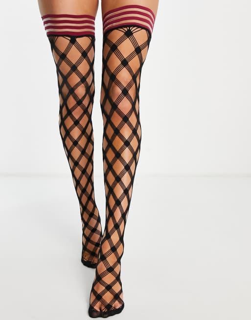 Hunkemöller – Halterlose Strümpfe aus Netzstoff-Mix in Schwarz mit kontrastierendem Rand in Rot