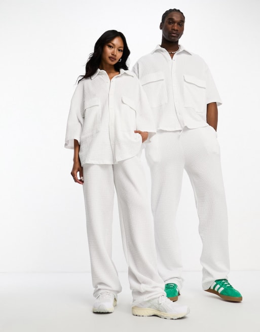 IIQUAL – Unisex-Set mit Hemd und Hose aus Seersucker in Weiß mit Taschendetail