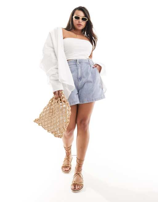 In The Style Plus – Exklusive Jeans-Shorts in verwaschenem Hellblau mit elastischem Paperbag-Bund