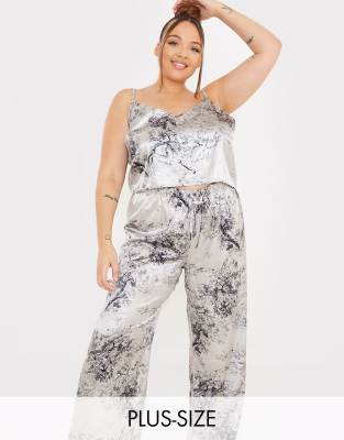 In The Style Plus x Lorna Luxe – Set aus Pyjama-Camisole und Hose aus Satin mit Kontrastborte in Navy/Bunt