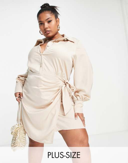 In The Style Plus x Terrie Mcevoy – Gewickeltes Mini-Hemdblusenkleid aus Satin in Steinbeige