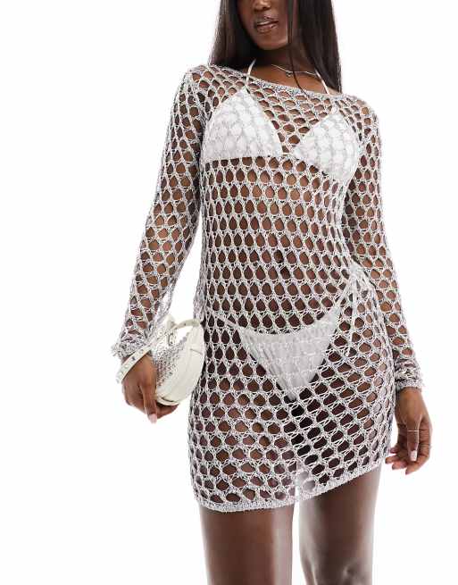 In The Style – Gehäkeltes, langärmliges Strand-Minikleid in Silber-Metallic mit U-Rückenausschnitt