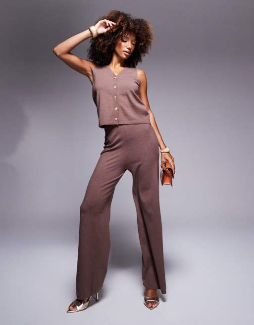 In The Style – Gestricktes Set in Schokoladenbraun aus Weste mit Knopfleiste und Hose mit weitem Schnitt