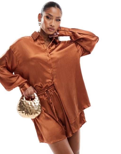 In The Style – Langärmlige Satin-Hemdbluse in Rostrot, Kombiteil