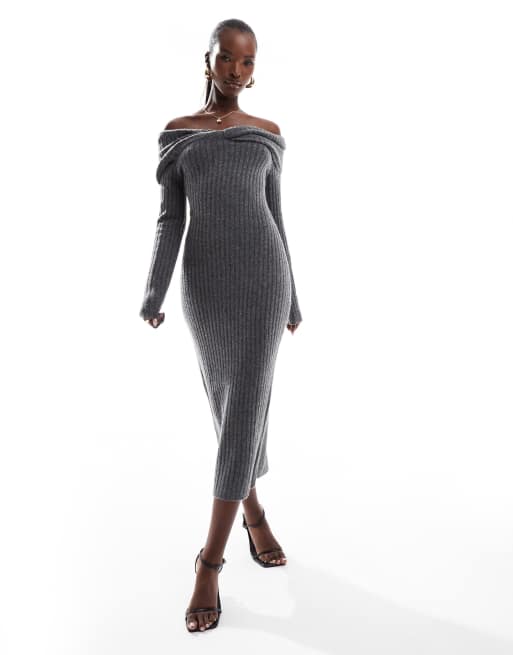 In The Style – Schulterfreies Strick-Pulloverkleid in Anthrazit in mittlerer Länge mit verdrehtem Detail