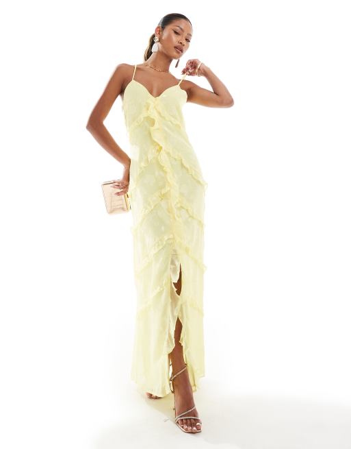 In The Style x Perrie Sian – Camisole-Maxikleid in zitronengelbem Jacquard mit Rüschenbesatz