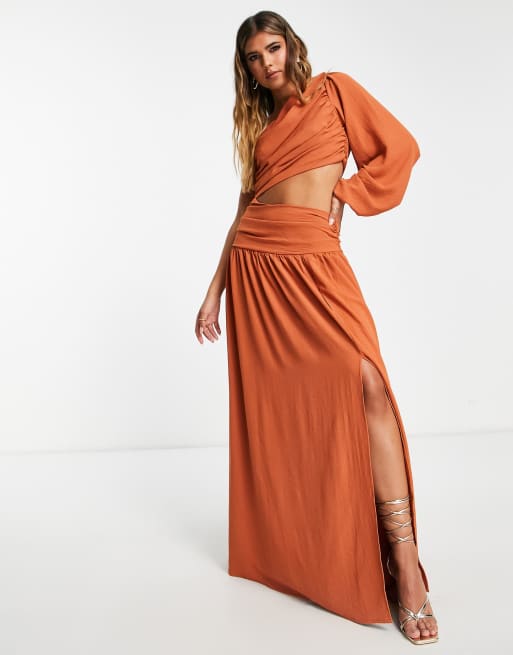 In The Style x Yasmin Devonport – Exklusives Maxikleid in Hellbraun mit Faltendetails, einem voluminösen Ärmel und Zierausschnitt in der Taille