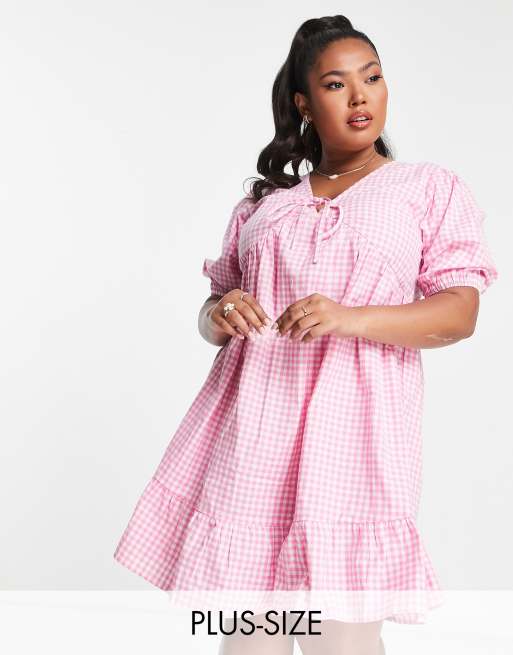 Influence Plus – Kurzärmliges, vorne gebundenes Minikleid in Rosa mit Vichy-Karomuster