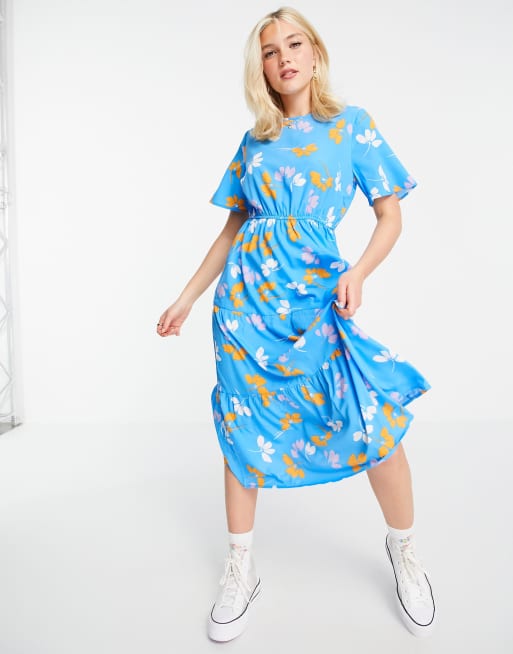 Influence – Blau geblümtes Midikleid mit gestuftem Saum