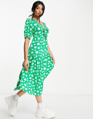 Influence – Gestuftes Midikleid in Grün geblümt mit Schleife vorne