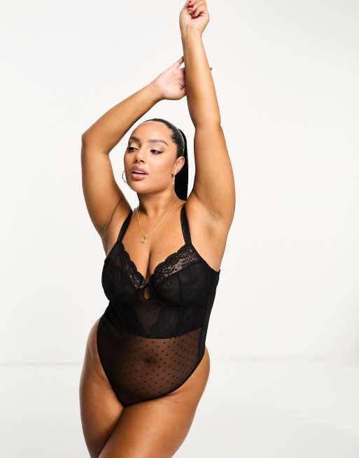 Ivory Rose Curve – Bügel-Body in Schwarz mit Tanga, Spitzeneinsatz und hohem Beinausschnitt